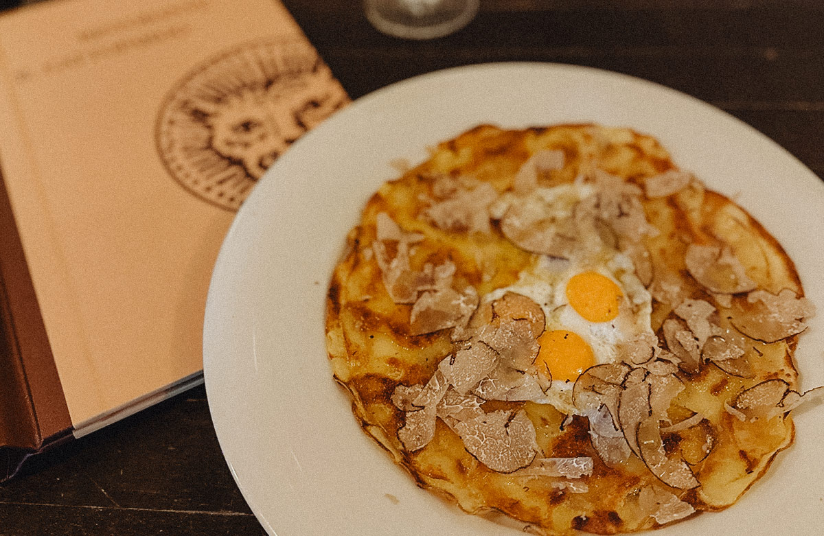 Darüber 3 - 5 Gramm weißen Trüffel hauchdünn darüber hobeln (am besten mit einem speziellen Trüffelhobel) und fertig ist eine wunderbare Trüffelvorspeise die perfekt zur Rotwein Jahreszeit passt.